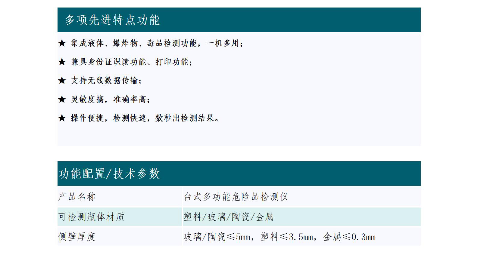 ★ 集成液体、爆炸物、毒品检测功能,一机多用;